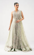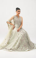 Celestial Aura is a Bridal vision of modern elegance wrapped in traditional artistry. This pastel-hued ensemble is crafted in a soothing mint-silver tone net fabric exuding sophistication and serenity. The sleeveless silhouette features an intricately embellished bodice with delicate handwork, sequins, and resham embroidery that cascade gracefully into flowing layers of sheer net and shamoz silk. This Bridal ensemble is completed with a finely detailed dupatta, edged with ornate embroidery and crystal accents, adding a hint of ethereal charm. Its dreamy color palette and fluid design make it a statement choice for weddings, receptions, and festive soirees. With its balance of contemporary cut and timeless embellishments, Celestial Aura embodies understated luxury-perfect for the woman who desires grace with a touch of grandeur.