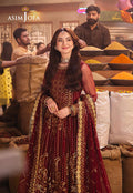 Own your power in this striking Indian red ensemble. It's a statement piece that exudes sophisticated fierceness. The intricate embroidery shimmers like a desert sunset-antique gold zari and red-rust threads entwine with glorious finesse, studded with 5mm cupped gold sequins that gleam like scattered jewels. The 16 kalis, meticulously embellished with stunning paisley motifs, unfurl like the petals of a red poppy dusted with desert gold. Paired with a magnificently embroidered dupatta, this isn't just an outfit-it's a symphony of power and celebration.