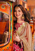 Let this purple outfit, with hints of asterss glamour, exude an aura of timeless allure. The meticulously embroidered shirt, a masterpiece in itself, features duo-toned mink and pink zari like stardust woven into the fabric. Light gold cupped sequins, sprinkled like dews on fallen aster petals, catch the light and whisper of forgotten wishes. A meticulously embroidered dupatta, a dreamlike cascade of elegance, completes the ensemble, carrying you to the heart of any occasion.