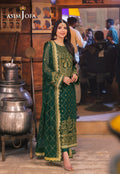 Step out of the emerald shadows in this mesmerizing ensemble, a verdant vision that captivates like hidden foliage. The embroidered shirt unfurls like a secret garden, adorned with intricate designs in duo-toned antique gold zari. Scattered light gold sequins shimmer like fireflies in dappled sunlight. Paired with a beautifully embroidered dupatta, this outfit becomes a symphony of nature's artistry, perfect for any festive occasion.