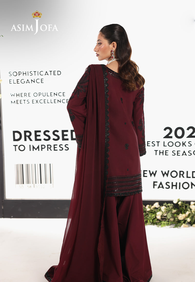 Effortlessly poised, this maroon ensemble channels understated allure with a contemporary twist. The shirt features sleek black threadwork accentuated by tonal black sequins, adding a soft shimmer and rich texture against the deep maroon base-a harmony of contrast and restraint. Paired with a flowy chiffon dupatta and matching trousers, the look is minimal yet magnetic, designed for moments where simplicity speaks volumes.