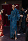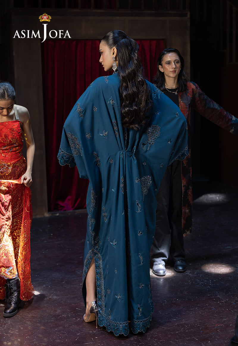 Drenched in a mesmerizing shade of teal, this kaftan channels effortless modernity with a hint of mystique. Its flowing silhouette is adorned with two-toned silver zari that catches the light like moonbeams on rippling water, while black sequins add a subtle, night-sky sparkle. Teal threadwork weaves delicately across the fabric, echoing the depth and richness of the hue itself. Striking a perfect balance between contemporary chic and understated glamour, this ensemble is a statement in stillness-bold yet graceful.