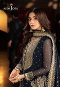 Reimagining regalia with a modern soul, this teal blue ensemble is a vision of grandeur. The shirt is exquisitely adorned with intricate doriwork, where antique and light gold twisted dori threads entwine like vines of heritage, brought to life with luminous zari that glimmers through every embroidered detail. The trousers echo the celestial vibe with stardust-inspired motifs, adding a gentle shimmer to the look. Completing the ensemble is a beautifully embroidered dupatta, flowing with a captivating wavy pattern that adds rhythm and movement. This is not just attire-itss a revival of royalty, crafted for the present.