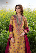 Like the golden glow of an autumn sunset, this marigold ensemble exudes warmth and opulence, a tribute to naturess most enchanting season. The sun-kissed shirt, bathed in a soft, luminous hue, reflects the amber brilliance of a flourishing garden, adorned with breathtaking floral embroidery in magenta, salmon pink, beige, and fuchsia threads. Paired with a contrasting embroidered dupatta and a beautifully printed trouser, this ensemble paints a tale of transformation, where naturess colors are at their most vibrant, alive with beauty and grace.