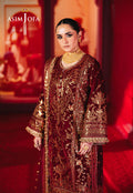 Radiating the fiery warmth of a dusky evening sky, this deep maroon-red ensemble kindles the flame of regal aura. The long shirt, an epitome of artistry, is adorned with intricate Indian gold zariwork that dances gracefully amidst shimmering 3mm cupped and 5mm flat sequins, while threadwork in deep maroon hues whispers tales of timeless elegance. Paired with a meticulously embroidered dupatta, draped like a veil of ethereal grace, this ensemble transforms into a portrait of unyielding majesty, a vision of infallible beauty.