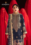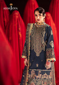 Shrouded in the mystique of a moonlit night, this dark grey ensemble is a tribute to Mughal opulence reimagined for the modern era. The straight velvet shirt serves as a regal canvas, adorned with antique gold zariwork that gleams like ancient treasures. Rust and sage green threadwork intertwine harmoniously, echoing the elegance of imperial gardens, while glistening matte gold sequins, like scattered stardust, add an ethereal glow. Paired with a delicately embroidered dupatta, this ensemble captures the grandeur of a bygone era, enveloping you in an aura of timeless sophistication.
