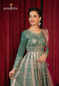 A symphony of surreal hues, this mint peshwas is an exquisite display of embroidered perfection. The kalis are adorned with light gold and two-toned mink zari, complemented by shimmering light gold sequins for a touch of luminosity. Paired with a contrasting plum-hued embroidered dupatta, this ensemble exudes an enchanting blend of vibrance and sophistication.