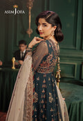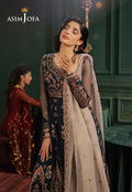 Evoking the grandeur of the Mughal era, this teal peshwas is adorned with meticulously embroidered kalis, featuring sage green, deep maroon, and rust threadwork. Antique copper and gold dori work enhance the detailing, while light gold cupped sequins, along with 3mm and 5mm sequins, add a dazzling touch to the heavy border. Paired with a contrasting embroidered dupatta in exquisite the zari net Ayudhia fabric, this ensemble is a masterpiece of traditional beauty.