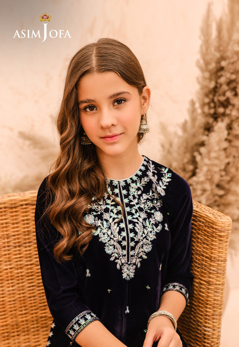 Exude regal charm with this navy-blue velvet ensemble, lavishly adorned with heavy embroidery. The ensemble includes a finely embroidered velvet shirt, tailored raw silk trousers, and a graceful net dupatta, making it a standout choice for special occasions.