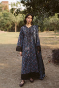 A timeless black ensemble featuring a digitally printed lawn shirt with intricate embroideries. The embroidered stripe organza dupatta adds elegance, while dyed cotton cuolette ensure comfort.