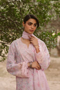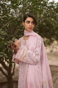Delicate floral embroideries graces a soft powder pink lawn dress, paired with a breezy dupatta and cotton culotte an ode to timeless elegance and effortless charm.