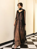 An enchanting gown adorned with intricate embroidery, crystal detailing, and delicate sequin accents, set against a captivating tie-dye palette of black and nude. The gown features a graceful flow and is complemented by crystal-adorned sleeves for a touch of glamour. Paired with a chiffon inner fabric, the matching net dupatta completes this ethereal ensemble.