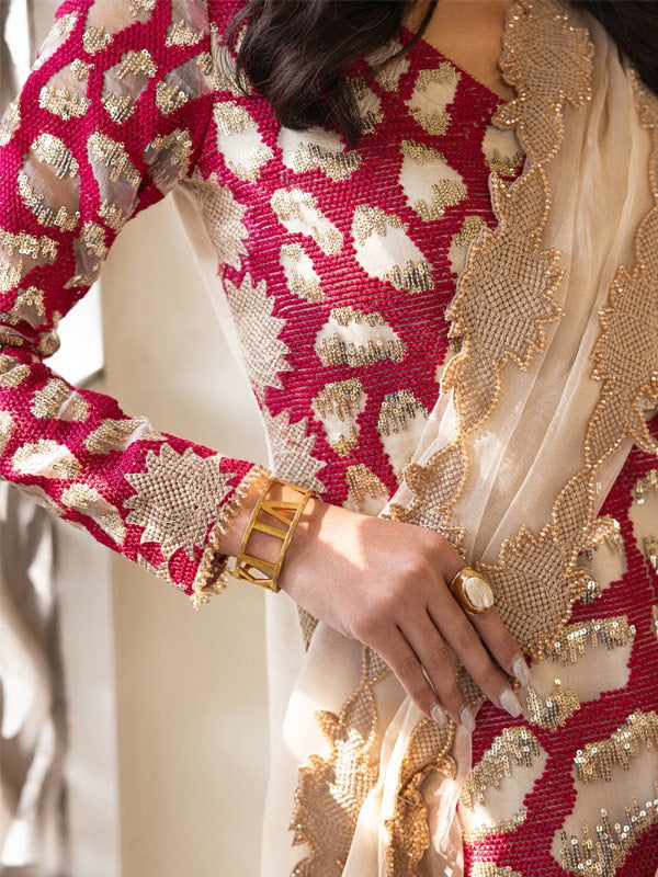 Step into modern sophistication with our captivating ensemble in a chic pink and off-white palette. The pure organza shirt and dupatta showcase contemporary flair through intricate embroidery, adorned with stylish sequins and crystals. Paired seamlessly with a luxe raw silk trouser, this outfit effortlessly exudes modern vibes, making a bold statement in elegance and trendsetting fashion.