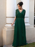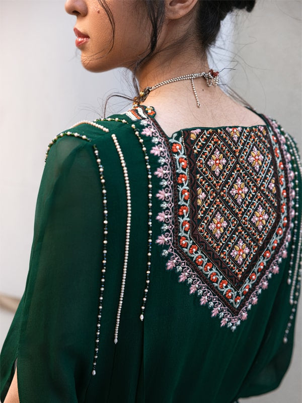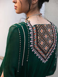 Exuding contemporary elegance, this green ensemble is crafted from chiffon, showcasing detailed embroidery, delicate hand embellishments, and sparkling crystals. The wavy V neckline adds a chic touch, while a stylish waist string enhances the silhouette for a modern, flattering look.