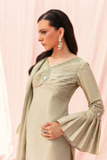 A truly distinctive and timeless expression of grace and allure, €˜Celestines is a pastel, sage green canvas designed to beckon the mind to a more classical and romantic age. A true ode to a nostalgic dream of sophistication and reimagined regency, this elusive ensemble of raw silk has pleating detailing across the bust and features frilled sleeves.