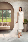 Bask in the glorious palette of alabaster and pearl whites with €˜ODETTEs. An elongated silhouette with oversized and textured floral stem embroideries with a geometric glistening jaal on the sleeves. Paired with an opulent net dupatta and raw silk culottes for a timeless impression.