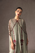 Sway with exceptional grace, and be the center of attention at every festive occasion with 'Serena'. A classic Caia design against a light mint canvas, with a luxurious, sheer cape that adds oomph and style. It features crystal detailing and lustrous hand-embroided motifs in a magical hue of red.
