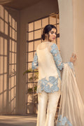 Redefine elegance with a subtle embellishment details in €˜SOLENEs. A beautiful sublime yellow base is adorned with a sky blue blooming imagery and a generous pearl spray all over the short length shirt. Paired with a heavily detailed accent border net dupatta in contrasting hues and culottes pants.