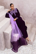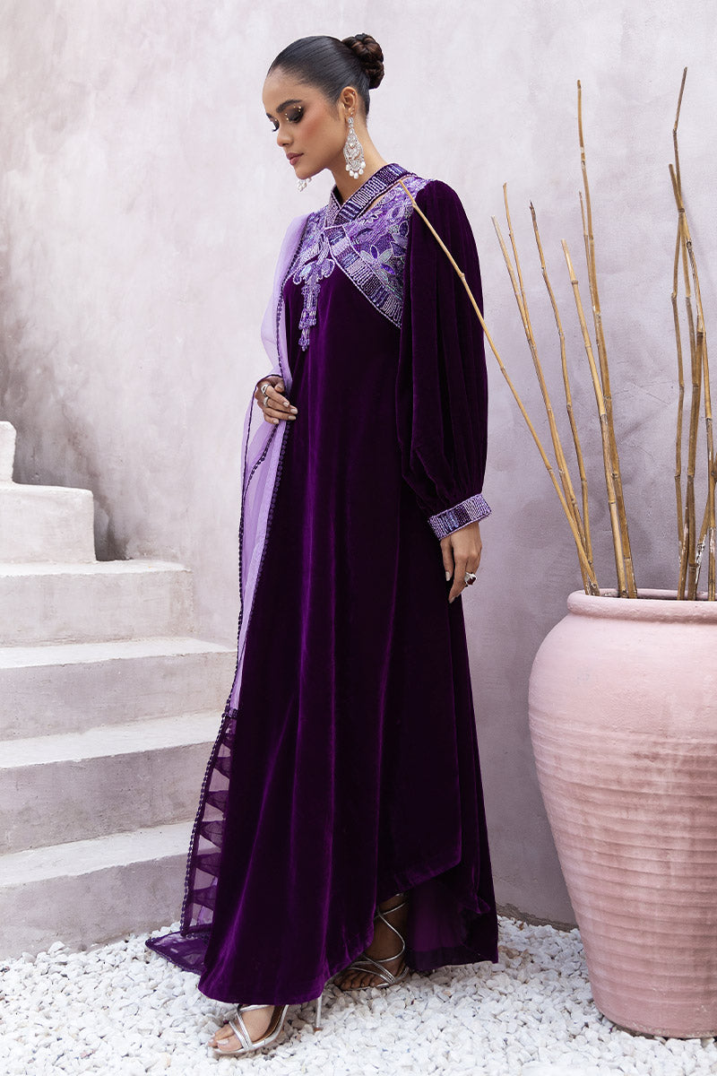 In a breathtaking deep shade of violet, this elegant long A-symmetrical frock silhouette stands as a true masterpiece. The puff sleeves and neckline are adorned with intricate handwork featuring beads, crystals, and cutdana, imparting a touch of glamour. The addition of a bow neckline on the back adds a charming detail to the ensemble.