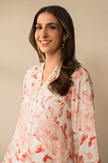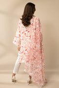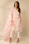 The CORAL IMPRESSION 3PC set features a loose-fitted A-line shirt and organza dupatta, both adorned with beautiful prints and intricate embroidery. Made from luxurious silk fabric, the wrap-around neckline and lace detail add a touch of elegance.