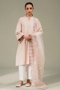 This PINK SHADOW-3 PIECE (SHIRT, TROUSER AND DUPATTA) is a beautifully designed outfit featuring an a-line paneled style in LAWN fabric. Its front and back are plain dyed, with a round neck and keyhole loop button detailing. The flared sleeves have lace and pintuck detailing, while the organza embroidered with cutwork adds a touch of elegance.