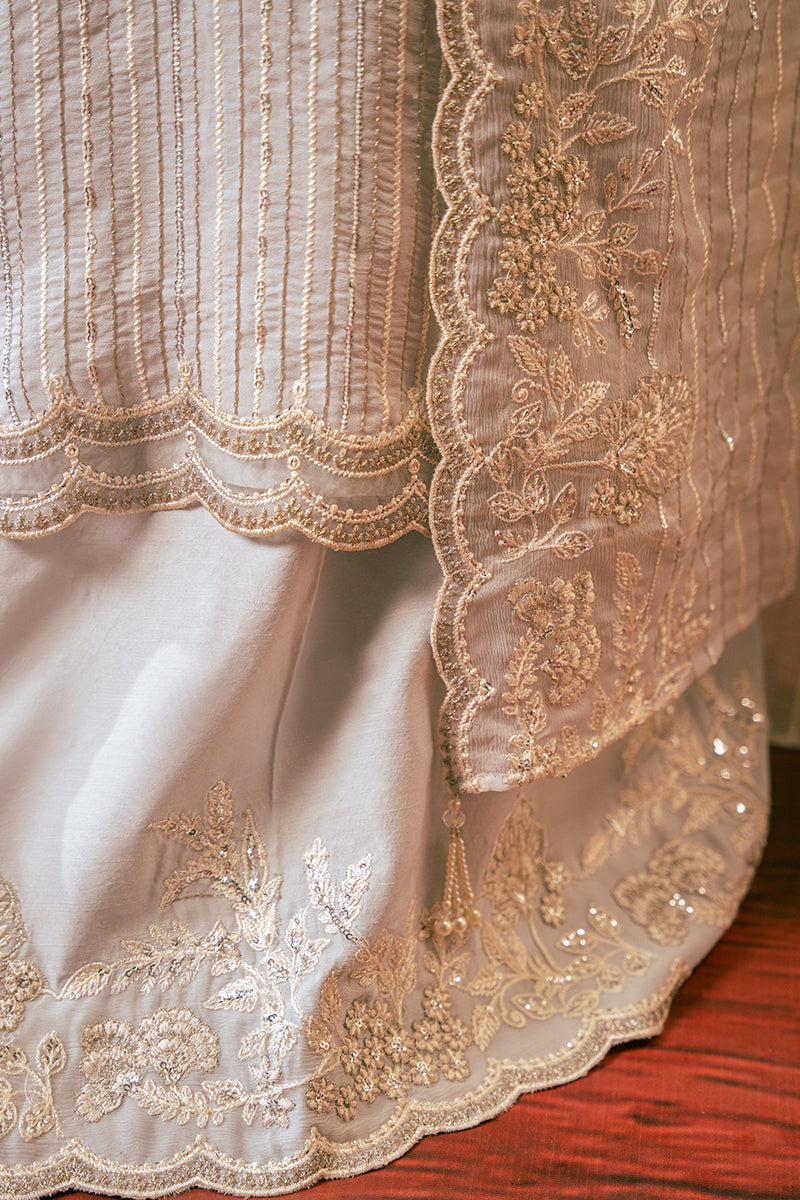 This elegant 4 piece suit features an intricately embroidered chiffon shirt with a 120" patti for the front hem, back hem, and sleeves. The silk dyed trouser is accented with a 60" embroidered patti, while the chiffon dupatta adds a delicate touch. Complete the look with the silk dyed slip. Perfect for a formal occasion.