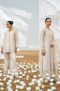 Introducing our GLAMOUR GLINT-3PC SILK EMBROIDERED PRET outfit. Made from luxury silk and organza materials, this set features an exquisitely crafted long shirt with delicate embroidery, a matching trouser with sheer patch detailing, and a stunning dupatta. The perfect elegant and stylish addition to your wardrobe.