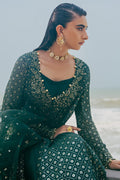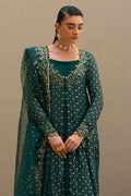 Indulge in luxury with our Green Spring 3-piece embroidered gown. The paneled front and sequin embroidery on the shirt exude elegance. The open jacket adds a touch of sophistication, with a crushed silk inner gown for ultimate comfort. The embroidered and embellished neckline and fitted sleeves with tassel detail complete the look. Complete it with the poly organza embroidered dupatta for a perfect finishing touch.