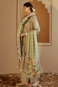 This 3-piece set includes a SAGE BLOOM shirt with an elegant marina print, featuring embroidered patti detailing on the shirt hem and sleeves. The matching trouser and dupatta also feature the marina print, creating a cohesive and stylish look.