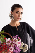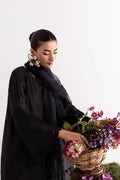 Step into elegance with this exquisite black dress, crafted from luxurious Korean raw silk and adorned with full-body intricate embroidery for a rich, opulent look. Delicate lace along the front open midline adds a sophisticated touch, blending tradition with modern style. Itss paired with sleek embroidered cigarette pants for a balanced and comfortable silhouette. A stunning embroidered organza dupatta completes the ensemble, offering a graceful, ethereal contrast to the deep tones of the dress.