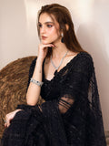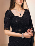 Exquisite black hand-embellished net saree, is adorned with intricate hand-embellishments and shimmering black beads, creating a mesmerizing pattern that captures the light and exudes elegance. Paired with a matching black handcrafted blouse, this ensemble showcases exceptional artistry. The blouse is embellished with sparkling black beads, adding a touch of glamour and refinement. The sleeves feature delicate hanging black tassels, offering a playful and elegant detail that enhances the overall opulence of the outfit.
