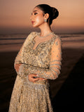 This dress in golden and champagne tones is adorned with intricate 3D floral elements, beads, pearls, and shimmering crystals, creating an opulent look. The silver and antique dabkha metal work adds a traditional touch, while the crystal-embroidered tulle sleeves offer elegance. A silver zipper provides modern functionality, and the ensemble is completed with a veil and dupatta, featuring detailed scalp work with pearls, sequins, and golden crystal accents.