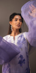 A beautifully botanical-printed short kameez and shalwar. The kameez showcases elegant embroidery and is enhanced with an additional layer of gradient organza, adding an exquisite touch. The shalwar is designed with a bordered end for a refined finish. Complementing the outfit is a gradient organza dupatta, completing the look with grace and sophistication.