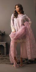 Introducing a beautiful short shirt in delicate pink grip georgette, featuring elegant embroidery on the daman and sleeves. This charming top is paired with matching grip trousers and complemented by a printed organza dupatta, adding a graceful and sophisticated touch to the ensemble.