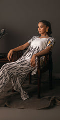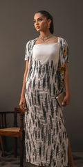 This striking ensemble features a sarong with spaghetti straps, designed in a delicate georgette fabric. The sarongss standout detail is its unusual sequence pattern of lines, which adds a contemporary and sophisticated edge to the classic silhouette. Paired with this is a matching jacket, which echoes the sarongss distinctive pattern and introduces a subtle hint of mustard in the floral accents, bringing a touch of warmth and vibrancy to the overall look. The jacketss short sleeves provide a modern, airy feel, perfectly complementing the sarongss fluidity. Together, these pieces create a cohesive and stylish outfit that exudes both elegance and individuality.