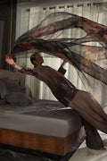 A gracefully tailored grip silk ensemble featuring an ombre printed base, adorned with contempo rary embroidered patterns. Paired with a chic Farshi Shalwar and a printed organza dupatta for an effortlessly elegant look.