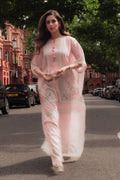 This kaftan radiates elegance with its exquisite botanical print set against a soft powder pink backdrop. Adorned with vibrant blooms, lush greenery, and delicate floral details, the intricate design adds a touch of refined charm. Crafted from lightweight georgette, it offers both grace and comfort in one beautifully designed piece.