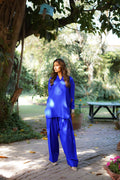 Make a bold statement with our Pure Raw Silk Shirt and Farshi Shalwar set in vibrant electric blue. Crafted from the finest raw silk, this ensemble offers a luxurious texture and a rich, lustrous finish that catches the light beautifully. The shirt features a flattering silhouette, while the Farshi shalwar offers an elegant, voluminous drape that adds a regal touch to the outfit. The striking electric blue color adds a modern twist to this timeless design, making it perfect for formal events, weddings, or special occasions. This outfit seamlessly combines traditional charm with contemporary style, ensuring you stand out in any crowd.