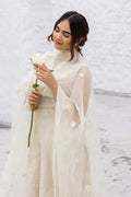 This elegant ensemble is crafted from soft cotton karandi in a sophisticated nude beige hue, featuring intricate ivory silk thread embroidery for a timeless appeal. The neckline is adorned with delicate pearl detailing, adding a touch of refinement. It is paired with a beautifully embroidered organza dupatta, enhancing the overall grace of the outfit. Completing the look are Korean silk pants, offering both comfort and luxury for a perfect finishing touch.