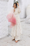 This elegant outfit is crafted from soft cotton karandi in a pristine pearl white hue. The front-open, loose-fit shirt features delicate button details and is beautifully embroidered with silk thread in blush nude, highlighting the cuffs and collar. The shirt is further adorned with charming embroidered polka dots all over, adding a playful touch to the design. It is paired with Korean silk trousers for a sleek and comfortable finish. Completing the look is a stunning organza dupatta with a unique dip-dye effect, adding a soft, gradient touch to this sophisticated ensemble.
