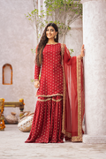 The decadent deep rose colored raw silk with all over sequence and tilla embroidered gharara and shirt with the finishing of fine and intricate border details paired with organza dupatta with 4 side embroidered borders.