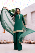 This emerald green raw silk shirt with delicacy of embroidery on it paired with raw silk shalwar and organza dupatta with 4 side embroidered borders to uplift the look.