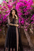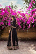 An enchanting lehenga tailored on a black canvas with heavily embellished borders with splashes of gold and fuschia. The blouse features floral embroidery handworked over the sleeves and a gold laced neckline. A gorgeous dupatta adorned with gota work and dainty motifs completes this magical look.