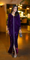 A graceful drop-length, front-open dress exuding elegance with its crystal-beaded neckline and shimmering side trim. The subtle color-block detailing adds a contemporary twist, making it the epitome of luxurious style for your winter soirees.