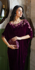 Elevate your winter wardrobe with this deep wine kaftan, a true embodiment of luxury. Featuring a chic neckline, adorned with exquisite cutwork embroidery in gleaming gold metallic thread and resham, itss a flawless fusion of opulence and artistry-designed to make you a style icon.
