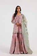A classically rich composition is layered over this graceful ensemble rendered in a graceful pink shade. It features a mesmerizing shirt adorned with captivating embroidery with aesthetically rich floral designs and embellished with scintillating details. Paired with a meticulously crafted embroidered gharara with beautiful floral embroidery, the style statement look is completed with a gracefully embroidered dupatta. Embrace this alluring outfit at festive events this season.