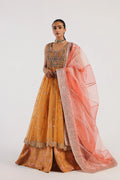 This beautifully crafted ensemble will make a timeless addition to your wardrobe. It comes with a graceful, elegant, and mesmerizing mustard shade sleeveless pishwas with intricate floral motifs embroidered in scintillating hues and illustrating intricate scalloped borders at bottom opening. Paired with a gracefully crafted contemporary flared lehnga adorned with aesthetically rich embroidery in vibrant hues. And complete the formal look with the classically draped contrasted pink dupatta featuring dazzling embroidery. An aesthetic outfit perfect for making a style statement at festive events.