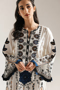 Dive into a world of artistic wonder with this stunning embroidered suit. This elegant two-piece ensemble is a masterpiece of intricate design. The long white shirt features elaborate, stylized floral and paisley patterns in a captivating palette of black, blue, and brown. The detailed embroidery on the front, sleeves, and hem creates a unique and sophisticated look. The suit is completed with matching trousers that feature a complementary print, making it a perfect choice for any special occasion.
