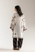 Make a bold statement with this suit that is a celebration of vibrant artistry. This striking two-piece embroidered suit features a clean, white canvas adorned with intricate, colorful floral and geometric patterns. The shirt boasts stunning embroidery in shades of red, black, and blue, creating a mesmerizing design that flows beautifully. The suit is completed with black shalwar that feature a contrasting pattern, adding a unique touch to the ensemble. This elegant and versatile outfit is perfect for both casual gatherings and festive occasions.
