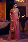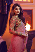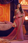 ˜Bageechas, an exquisitely draped rose pink saree is heavily adorned with sparkling details of glistening beads, seed pearls and gold threadwork on the blouse and the border of the saree. This ensemble's most versatile evening looks will easily take you from festive events to evening soirees.